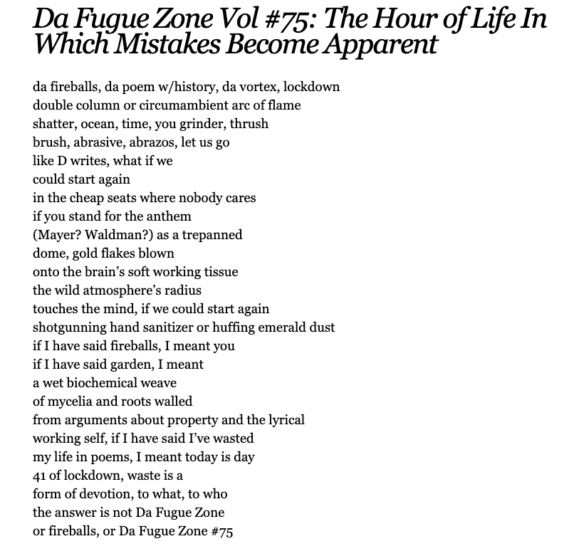 Thanks to the Danika Stegeman LeMay for summoning my words from the Rust Dimension, I’ve got 3 new poems in Sporklet 15: “Da Fugue Zone Vol #23: I desire oblivion, rhythm, breakfast,” “Da Fugue Zone Vol #25: The Hour of Life In Which Mistakes Become Apparent,” and, ugh, “Sonnet On Fourteen One Dollar Bills in a Container with Several Copies of this Sonnet Each Line Available to Purchase for One Dollar and Fourteen Cents.”