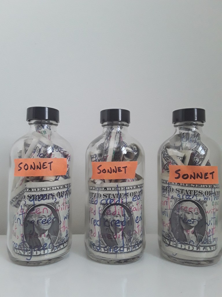 These sonnets are a naked play for legitimacy, like as if Lord Harrington had written sonnets to the queen instead of a mock-epic pamphlet on toilets. You can read them line by line, dollar by dollar, or throw the bottle against a wall and spend the feathers, or place the bottle on your shelf and admire the striations of money, which will spend, and the mark of a hand, which will live on past its mark and then not. Or you can imagine in the curled bills the phonemes at play against the discipline of the sonnet’s metrical grid. A poem that is bitter, or poem you imagine that is better than a poem could be. Money!