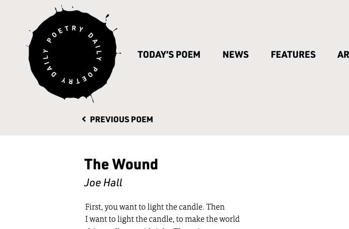 On Sunday, Poetry Daily re-published my poem “The Wound” from Fugue & Strike. Thank you, Poetry Daily. Here’s a statement I wrote on the poem: