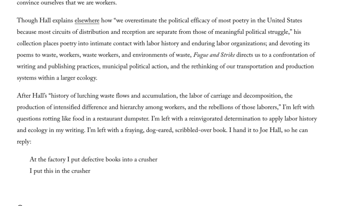 It’s really rare to be read capaciously, for one’s work to be presented with a thick sense of its context–and for the reader to make their own idiosyncratic constellations with parts of the work. While seeking something like the truth of the work, reviews should have the fingerprints of their reviewer all over it. At least that’s how I like to read them. Anyway, all the way back in September, Community Mausoleum published Alex Benedict’s essay/review of my 2023 book Fugue & Strike, and I’m finally finding the time to say how gratified I am for the deep attention and insight Benedict brought to it. & I learned a lot more about d.a. levy, Cleveland, and Meagan Day’s “Ode to Sanitation Workers.”