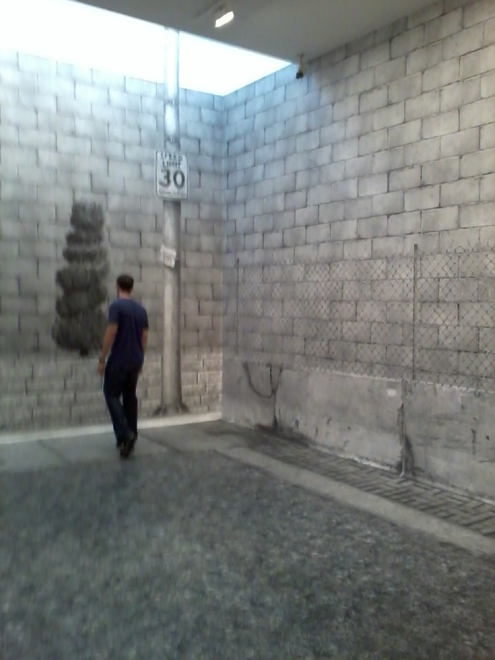 Perhaps more interesting in the flattening of wood grain walls and grass is that I had the impression I was moving through a 1990s 3-D corridor video game environment where there is no texture and no possibility of engaging with the particulars of the environment, just movement through various iterations of a maze.